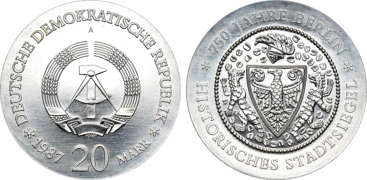 Серебро. 20,98г. Берлин (А). Отчеканена в память 750-летия Берлина. KM 119.1. Jaeger 1617. MS 67.