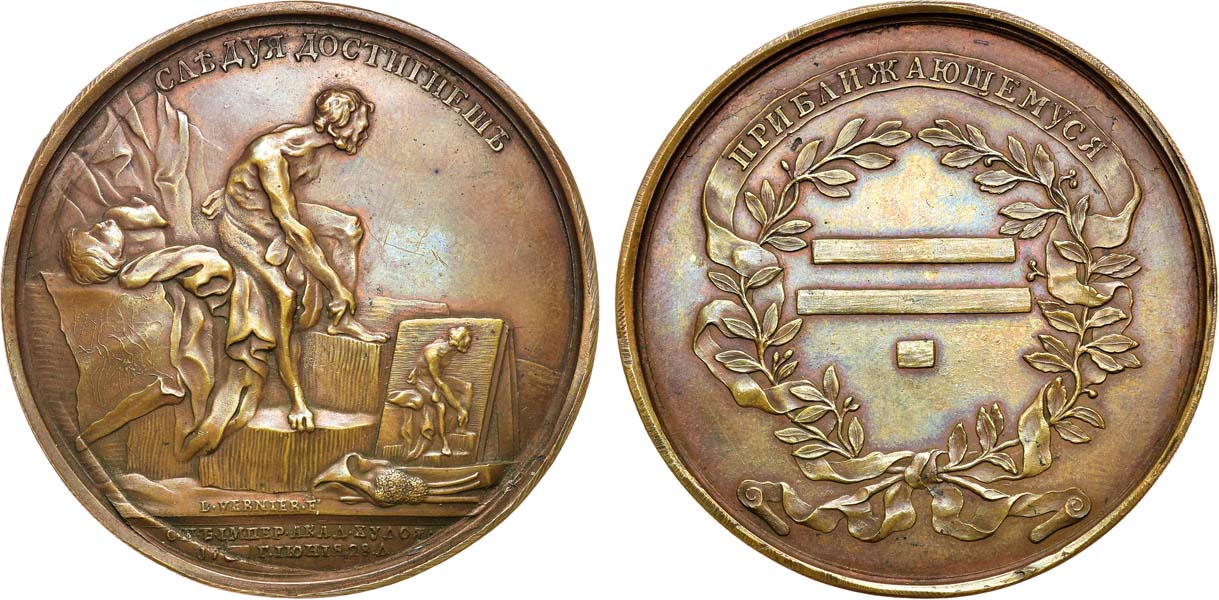 Бронза. 58,46г. Диаметр 53 мм. Санкт-Петербургский монетный двор. Медальер Пьер Луи Вернье (аверс – в центре над обрезом: "L.VERNIER.F"). Смирнов 252(*). Дьяков 129.1. AU/UNC.