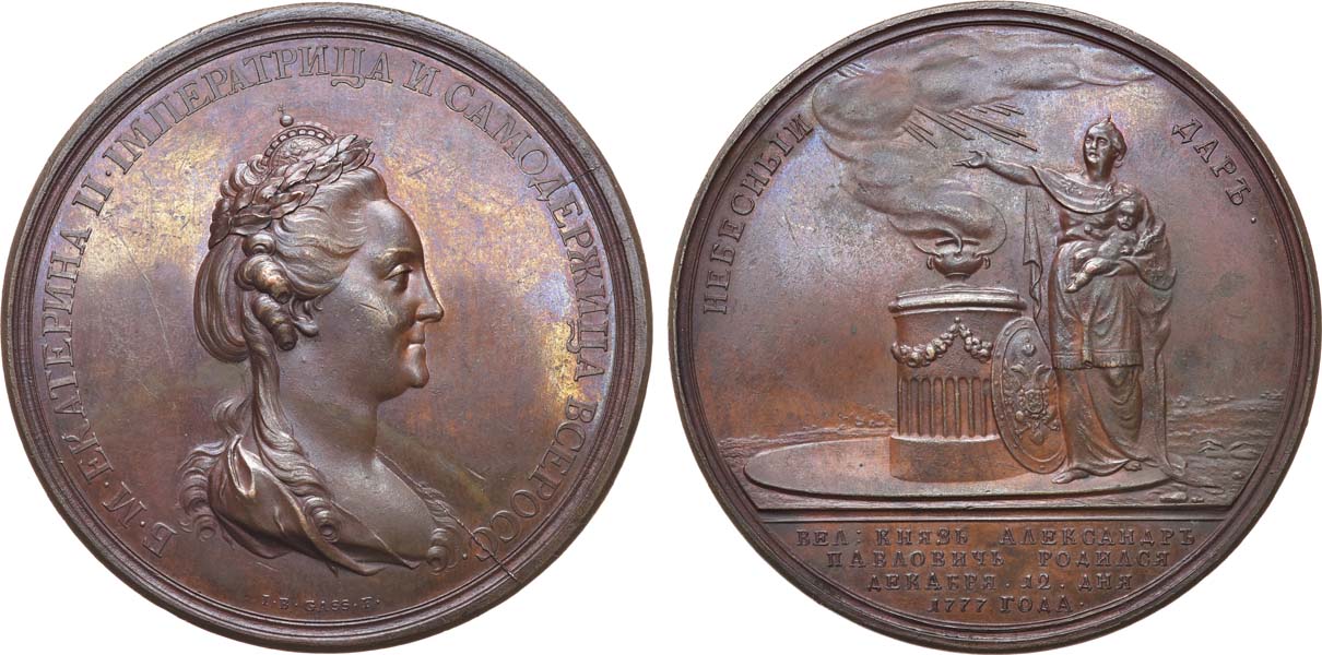 Бронза. 152,09г. Диаметр 65 мм. Санкт-Петербургский монетный двор. Аверс: медальер И.Б. Гасс (под изображением на поле: "I•B•GASS•F•"), реверс — без подписи медальера. Дьяков : аверс-176.1(R1); реверс-176.2(R1). MS 62.