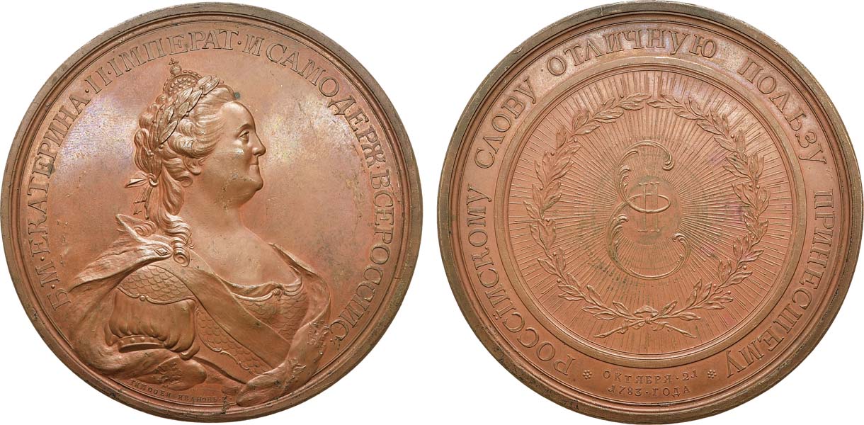 Бронза. 221,63г. Диаметр 83 мм. Санкт-Петербургский монетный двор, конец XVIII в. Аверс: медальер Т.И. Иванов (под обрезом изображения: "ТИМОѲЕИ ИВАНОВЪ"). Смирнов 297а. Дьяков 199.2. MS 62.
