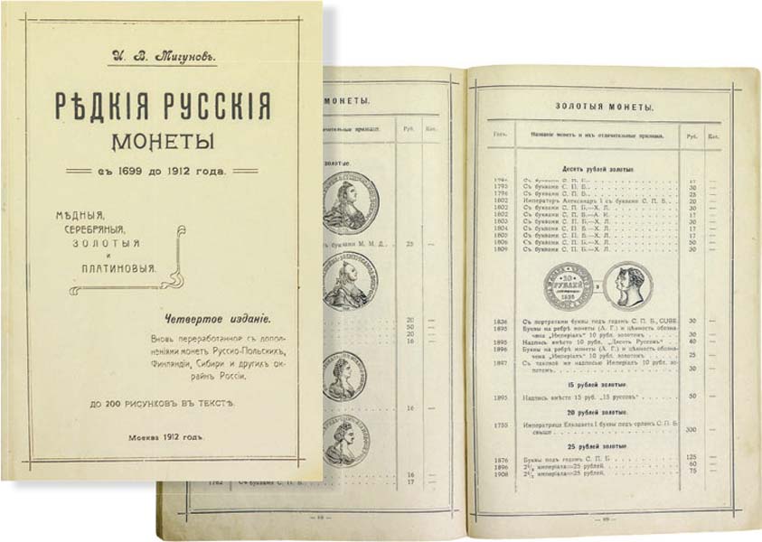 Москва, 1912 год. 96 стр. Самый известный торговый каталог из выпускаемых в России в начале XX века. В нем указаны цены, по которым И.В. Мигунов был готов покупать у населения редкие монеты. Содержит рисунки многих раритетов.