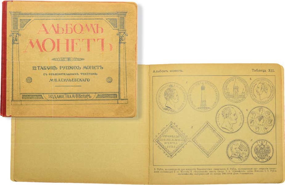 Руководство для начинающих собирателей. СПБ, Москва, 1913 г. 16 страниц + 12 таблиц илл. Книга знакомит читателей с основными типами русских монет, начиная с времен удельных княжеств и заканчивая современными году издания.