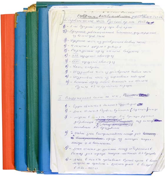 Москва, 2007 г. Рукопись включает более 150 страниц формата А4 рукописного и печатного текста с авторскими пометками и исправлениями. Отдельно приложены 4 папки с репринтами архивных документов и оригиналами гравюр по темам: награды Белого движения, нагрудные знаки и жетоны полков, военных и гражданских учебных заведений и ведомств, знамёна полков русской армии.