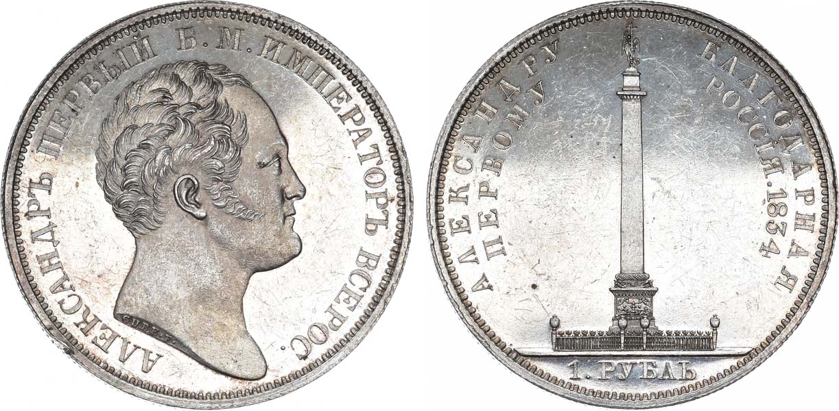 Серебро. 20,74г. Чеканен по случаю открытия Александровской колонны в Санкт-Петербурге. В обрезе шеи "GUBE F." Уздеников 4183. Биткин 894(R). 1 рубль 75 копеек по Петрову. PROOF 62.