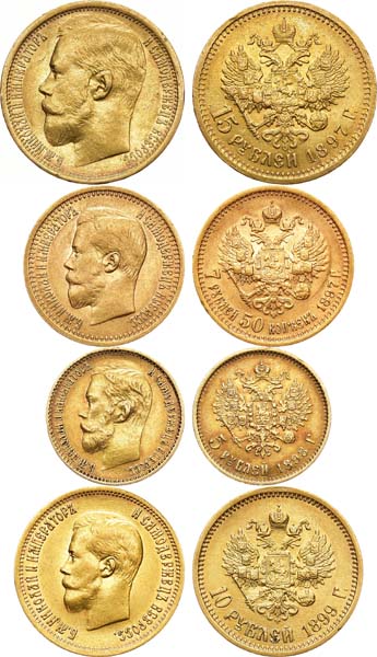 15 рублей 1897 года. "СС" за срезом шеи. Золото, 12,88 г. Казаков 66(R1), HHP 1972. XF+. 7 рублей 50 копеек 1897 года. Золото, 6,43 г. Узкий кант. Казаков 67(R), HHP 3971. AU. 5 рублей 1898 года. Золото, 4,28 г. Казаков 109. ННР 4981. AU/UNC. 10 рублей 1899 года. АГ (АГ). Золото, 8,59 г. Казаков 149(R), ННР 2991. UNC.
