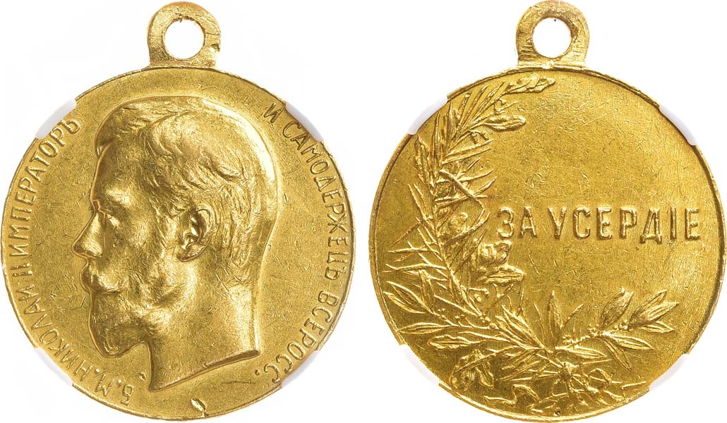 Золото. Диаметр 30 мм. Санкт-Петербургский монетный двор, 1895-1915 гг. Медальер А.Ф. Васютинский (без подписи). Аверс: портрет Императора Николая II. Биткин 1117о(R). Смирнов 1038/б. Дьяков 1138.3(R1). AU 53.