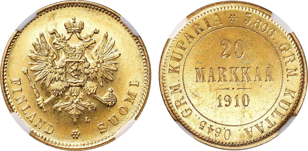 Золото. Для Финляндии. Гельсингфорсский монетный двор. Уздеников 4801(–). Биткин 387. Казаков 389(R). MS 63.