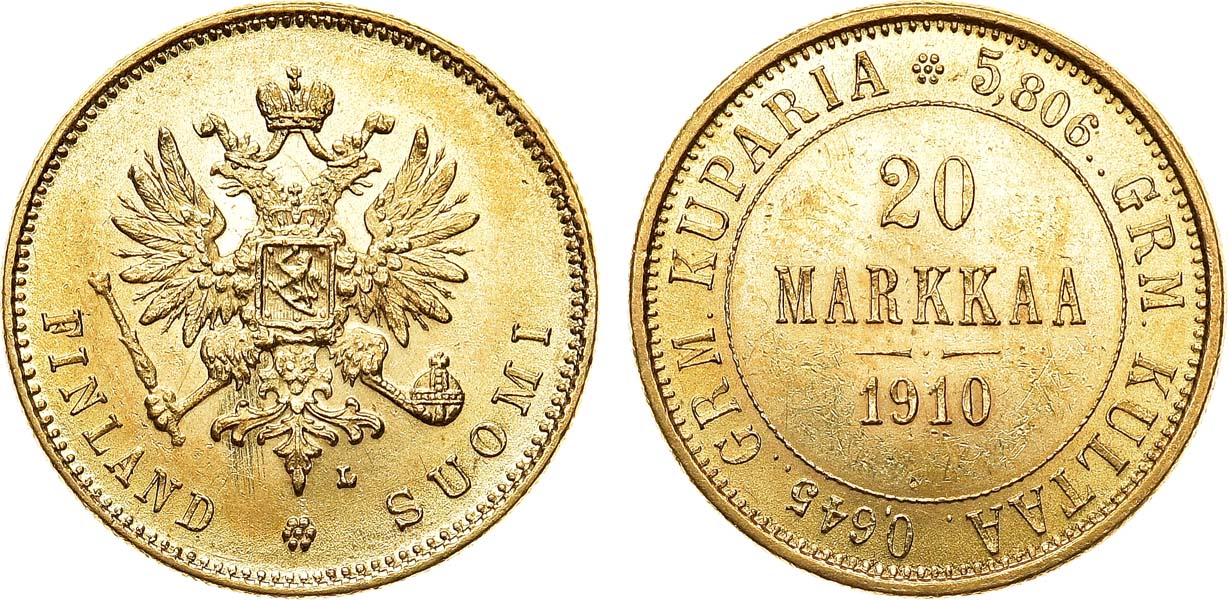 Золото. 6,43г. Для Финляндии. Гельсингфорсский монетный двор. Тираж: 201000 экз. Уздеников 4801(–). Биткин 387. Казаков 389(R). MS 62.