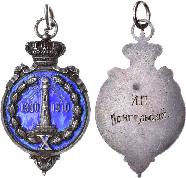 Серебро, эмаль. 10,18г. Размеры: 43х25 мм. С оригинальным подвесным кольцом. Клейма: фирменное «NK» (2 клейма на ушке жетона и одно на соединительном кольце). Гравировка на реверсе: "И.П. Понгельскiй". Российская Империя, Санкт-Петербург, 1910 год. UNC.