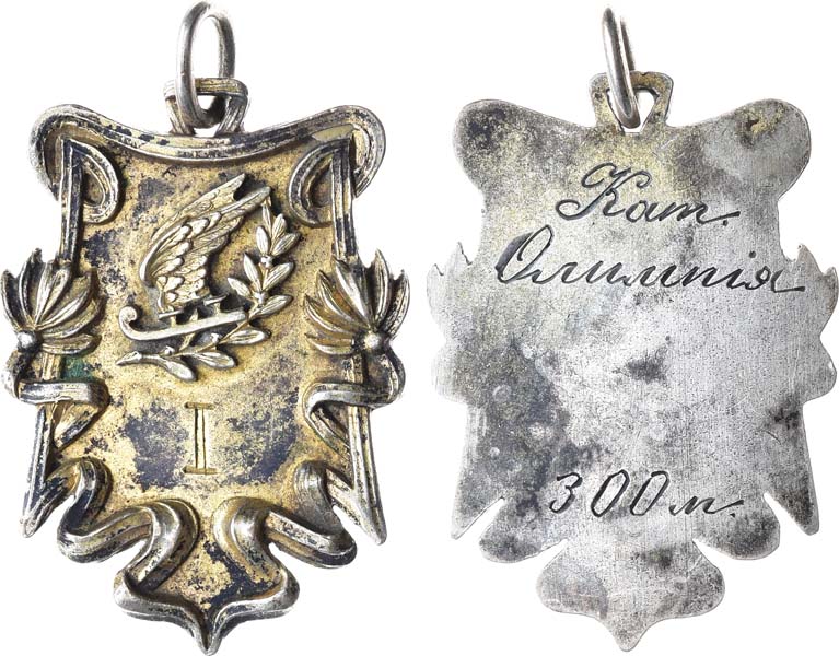Серебро, золочение. 9,38г. Размеры: 35х22 мм. С оригинальным подвесным кольцом. Гравировка на реверсе: "Кат. Олимпiя / 300 м". Российская Империя, Санкт-Петербург, 1910-ее гг. UNC.