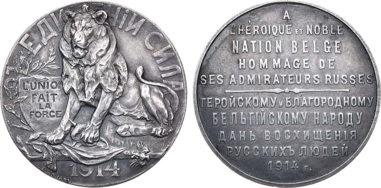 Серебро. 18,75г. Из серии медалей Российского Общества нумизматов в память Первой мировой войны 1914–1918 гг. Диаметр 32,3 мм. Петроград, 1914 г. Мастерская (ателье) А.Ф. Жакара (аверс — внизу слева у окружности: "А.ЖАКАРЪ"). Медальер Г.И. Малышев (без подписи). Дьяков 1581.1(R1). MS 64.