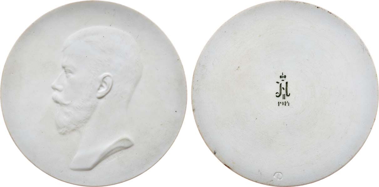 Фарфор. 77,48г. Диаметр 95 мм. Санкт-Петербург, Императорский фарфоровый завод (на реверсе по центру марка по бисквиту "вензель Николая II / 1914", на шесть часов инициалы формовщика в массе "D"). Медальер (скульптор) А.К. Тимус (на аверсе под обрезом "Тимусъ"), модель 1902 года. UNC.