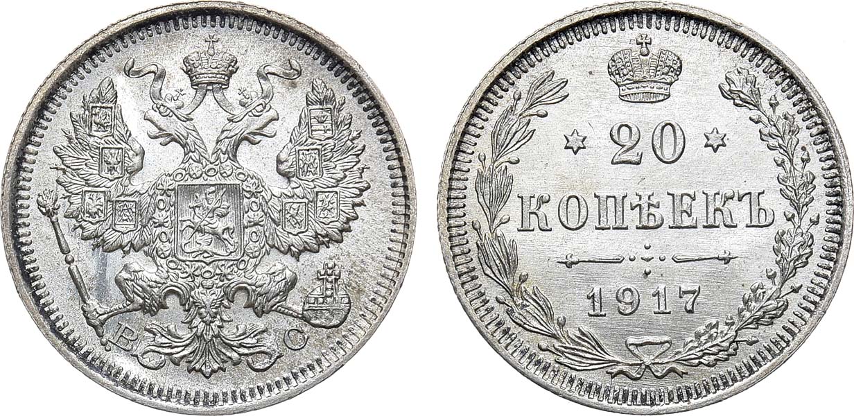 Серебро. 3,47г. Петроградский монетный двор. Уздеников 2224(•). Биткин 119(R1). Казаков 524(R). MS 66.
