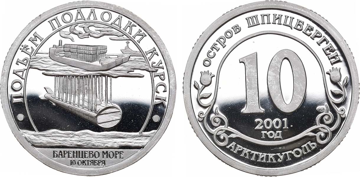 Медно-никелевый сплав. 11,97г. Санкт-Петербургский монетный двор. Аверс: "КУРСК" без кавычек. Реверс: без надписи "РАЗМЕННЫЙ ЗНАК". Тираж 500 экз. Фролов 4.1.1. PF 67.