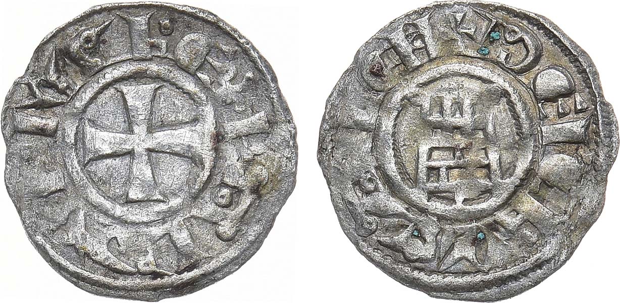 Серебро. 0,79г. Иерусалим. Аверс: изображение креста внутри окружности; круговая легенда "+BALDVINVS REX". Реверс: изображение башни; круговая легенда "+DE bIЄRVSALЄH". AU.