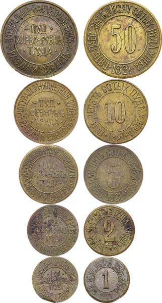 50 сотых пуда хлеба 1921 года. Диаметр 24,5 мм. Бронза, 3,81 г. Федорин VI 17-РДЗ (800 у.е.). AU. 10 сотых пуда хлеба 1921 года. Диаметр 20 мм. Бронза, 2,78 г. Федорин VI 16-РДЗ (200 у.е.). MS 63. Чёткий рельеф. Ровный штемпельный блеск. Светлая охристая патина. Редка. 5 сотых пуда хлеба 1921 года. Диаметр 18,5 мм. Бронза, 2,04 г. Федорин VI 15-РДЗ (200 у.е.). MS 63. Отборный коллекционный экземпляр. Красивый чёткий рельеф. Насыщенная светло-коричневая патина. Редка. 2 сотых пуда хлеба 1921 года. Диаметр 16 мм. Бронза, 1,58 г. Федорин VI 14-РДЗ (200 у.е.). AU/UNC. Остатки штемпельного блеска. Следы окислов. Пятна. Редка. 1 сотая пуда хлеба 1921 года. Диаметр 14,5 мм. Бронза, 1,26 г. Федорин VI 13-РДЗ (200 у.е.). MS 62. Яркий штемпельный блеск. Красивая коричневая патина. Редка.