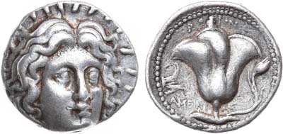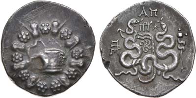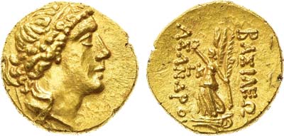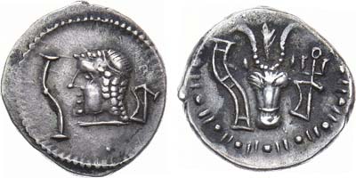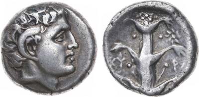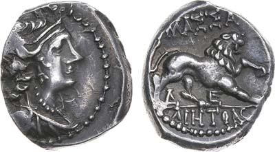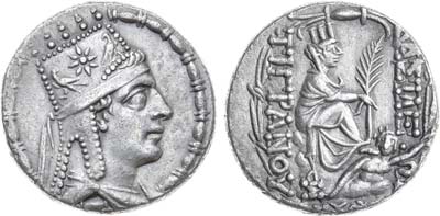 Серебро. 15,54г. Тигранокерт. Аверс: портрет Тиграна II в диадеме, украшенной звездой между двумя орлами. Реверс: легенда "BAΣIΛEΩ-Σ / TIΓPANOY"; изображение богини Тихе, сидящей на камне с лавровой ветвью в руке; внизу - изображение речного бога Оронта, плывущего вправо; внизу монограмма. AU.