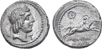 Серебро. 3,76г. Рим. Аверс: изображение головы Аполлона - вправо; справа на поле монограмма "Т". Реверс: изображение всадника, скачущего вправо с пальмовой ветвью; над ним изображение колеса; внизу легенда в две строки "L PISO FRVGI / ROMA". Sear 235. AU.
