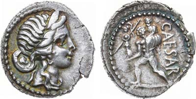 Серебро. 3,94г. Передвижной военный монетный двор в Северной Африке. Аверс: изображение головы богини Венеры в диадеме вправо. Реверс: изображение Энея с Анхисом и Палладой на руках; вертикальная легенда "CAESAR". XF+.