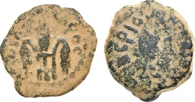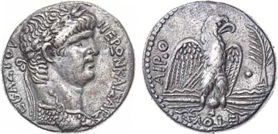 Биллон. 14,8г. Антиохия-на-Оронте. Аверс: портрет Нерона вправо; круговая легенда: "ΝΕΡΩΝ ΚΑΙΣΑΡ ΣΕΒΑΣΤΟΣ". Реверс: изображение орла с распростёртыми крыльями с молниями под ним - вправо, справа пальмовая ветвь; круговая легенда: "ETOYΣ AIP • Θ". XF.
