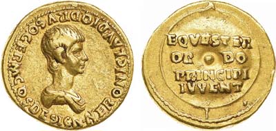 Золото. 7,6г. Рим. Аверс: круговая легенда "NERONI CLAVDIO DRVSO GERM COS DESIGN"; портрет императора вправо. Реверс: легенда в 4 строки "EQVESTER / OR - DO / PRINCIPI / IVVENT". Sear 1916 RR. RIC 78. BMC 90. Calico 407. Kent-Hirmer 181. Biaggi 223. Mazzini 96.. AU.