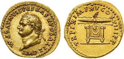 Золото. 7,28г. Рим. Аверс: круговая легенда "IMP TITVS CAES VESPASIAN AVG P M"; портрет императора в лавровом венке влево. Реверс: круговая легенда "TR P IX IMP XV COS VIII P P". BMC 55. RIC 118. CBN 42. Calicó 753.. AU.