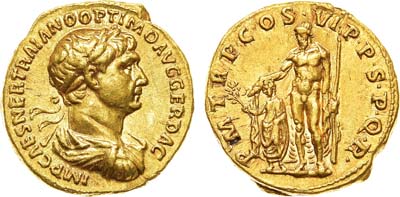Золото. 7,19г. Рим. Аверс: круговая легенда "IMP CAES NER TRAIANO OPTIMO AVG GER DAC"; портрет императора - вправо. Реверс: круговая легенда "PM TR P COS VI•P•P•S•P•Q•R"; изображение Юпитера и Траяна - вправо. C 268 var. (без кирасы) BMC 533 RIC 336 var. (без кирасы) CBN 814 Calicé 1065 Woytek 512f. AU.