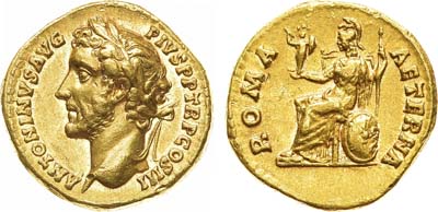 Золото. 6,48г. Рим. Аверс: круговая легенда "ANTONINVS AVG PI - VS P P TR P COSIII"; портрет императора в лавровом венке влево. Реверс: круговая легенда "ROMA AETERNA"; изображение персонификации Рима в военных доспехах на троне, с копьём и богиней Никой в руках - влево. Sear 4018. AU.