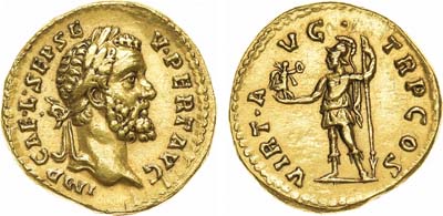 Золото. 7,28г. Рим. Аверс: круговая легенда "IMP GAE L SEPSEV PERTAVC"; изображение императора вправо. Реверс: круговая легенда "VIRT AVG TR P COS"; персонификация Рима влево с богиней Викторией на правой руке и копьём - в левой. Sear 6243. RIC 24. AU.