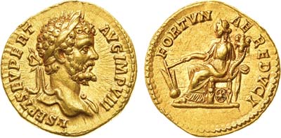 Золото. 7,2г. Рим. Аверс: круговая легенда "L SEPT SEV PERT — AVG IMP VIII"; портрет императора в лавровом венке вправо. Реверс: круговая легенда "FORTVN — AE REDVCI"; тронное изображение Фортуны - влево. C 187 вар. (драпированная и в кирасе). BMC 160 и pl. LX, 10 (эти штампы). RIC 78e. Калисе 2455 (аверс). AU.