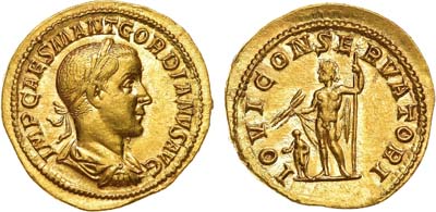 Золото. 4,99г. Рим. Аверс: круговая легенда "IMP CAES M ANT GORDIANVS AVG"; портрет императора в лавровом венке вправо. Реверс: круговая легенда "IOVI CONSERVATORI"; ростовое изображение Юпитера - вправо, с копьём в левой руке и пучком молний - в правой; ростовое изображение императора - рядом с ним. Sear 8570. UNC.