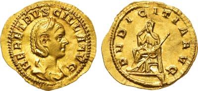 Золото. 3,72г. Рим. Аверс: круговая легенда "HER ETRVSCILLA AVG"; изображение Этрусциллы вправо. Реверс: круговая легенда "PVDICITIA AVG"; изображение Пудиции (богини стыдливости и целомудрия) на троне - влево. Sear 9489. RIC 59a. Hanter 9 var. UNC.