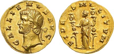 Золото. 3,66г. Рим. Аверс: круговая легенда "GALLIENVS AVG"; портрет императора в лавровом венке влево. Реверс: круговая легенда "FIDES MILITVM"; ростовое изображение богини Фидес с двумя штандартами - влево. RIC 38 вар. (обновленная легенда); Calicó 3494-5 вар.. UNC.