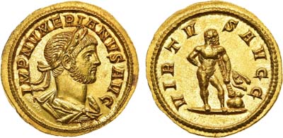 Золото. 5,36г. Рим. Аверс: круговая легенда "IMP NVMERIANVS AVG"; портрет императора в лавровом венке вправо. Реверс: круговая легенда "VIRTVS AVGG"; ростовое изображение Геркулеса с палицей вправо. Calico 4335(R2). Sear 12240. UNC.