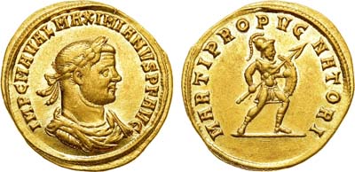 Золото. 6,44г. Сисция. Аверс: круговая легенда "IMP C M AVAL MAXIMIANVS PF AVG"; портрет императора в лавровом венке - вправо. Реверс: круговая легенда "MARTI PROPVGNATORI"; изображение бога Марса с копьём и щитом - вправо. Calico 4710a, Sear 13048, Depeyrot p.95. 1/10.. AU.
