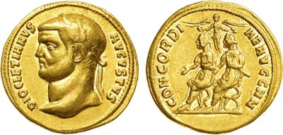 Золото. 6,4г. Кизик. Аверс: круговая легенда "DIOCLECTIANVS AVGVSTVS"; портрет императора в лавровом венке влево. Реверс: круговая легенда "COMCORDIAE AVGG NN"; изображение Диоклектиана и Максимиана с богиней Викторией над ними. Sear 12505, Calico 4429, C.38, Hunter iv,59. XF+.