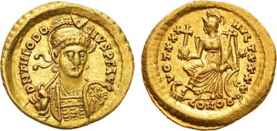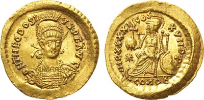 Золото. 4,43г. Константинополь. Аверс: изображение императора анфас в военных доспехах с копьём; круговая легенда "DN THEODOS VS PF AVC". Реверс: круговая легенда "IMP XXXXII COS XVII PP"; персонификация Константинополя на троне влево; под линией обреза "COMOB". Sear 21140. AU/UNC.