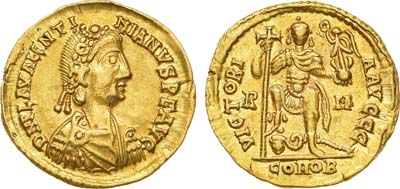 Золото. 4,41г. Рим. Аверс: круговая легенда "DN PLA VALENTINIANVS PF AVG"; портрет императора вправо. Реверс: круговая легенда "VICTORIA AVGGG"; ростовое изображение императора в военных доспехах, под линией обреза "COMOB". Обозначение монетного двора "R-M". Sear 21264. AU.