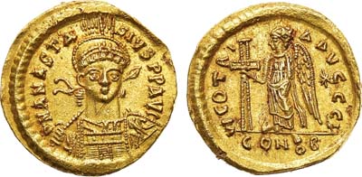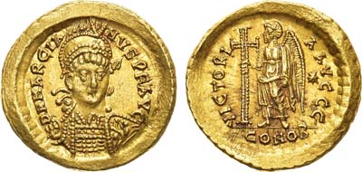 Золото. 4,47г. Константинополь. Аверс: изображение императора анфас в военных доспехах с копьём; круговая легенда "DN MARCIA-NVS PF AVG". Реверс: изображение богини победы Виктории, держащей Крест; справа на поле звезда; под линией обреза "CONOB"; круговая легенда "VICTORIA AAVCCC". AU/UNC.