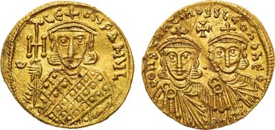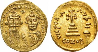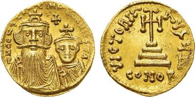 Золото. 4,47г. Константинополь. Аверс: круговая легенда "ddNN hЕRACLIЧS ЕT hЕRA CONST PP AV"; портреты императоров Ираклия и Ираклия Константина анфас. Реверс: круговая легенда "VICTORIA AV ГЧ"; изображение Креста на алтаре из 4 ступеней. внизу "CONOB". Sommer 11.21. Sear 753. AU/UNC.