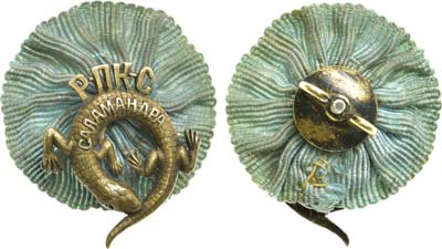 Серебро, оксидирование, золочение. 20,84г. Размеры 44,5х32,4 мм. Российская империя, Санкт-Петербург, фирма "Э. Кортман", после 1913 года. Клейма на знаке: 1. Санкт-Петербургского окружного пробирного управления после 1908 года ("альфа", женская голова в кокошнике вправо, "84") в овальном щитке. 2. Знак удостоверения Санкт-Петербургского окружногопробирного управления после 1908 года в круглом щитке (женская голова в кокошнике вправо, точка под подбородком). 3. Именное клеймо "К.П". Патрикеев, Бойнович 14.3. UNC.