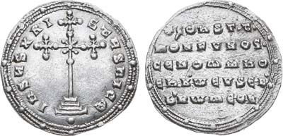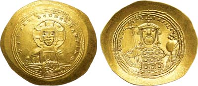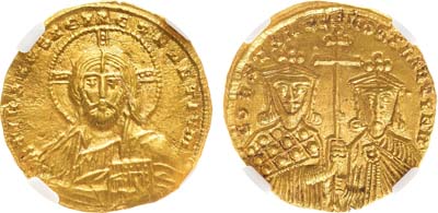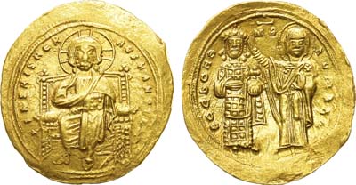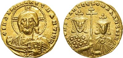 Золото. Константинополь. Аверс: бюст Иисуса, нимб с крестом, правая рука поднята для благословения, в левой руке Евангелие; легенда "+IhS XPS REX REГNANTIЧN". Реверс: двойной поясной портрет Константина VII слева и Романа II справа, между ними большой патриарший крест; легенда "COПSTAПT' ET ROMAh'AЧГГ b' ". Sear 1751. Sommer 36.9. AU.