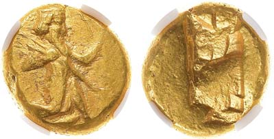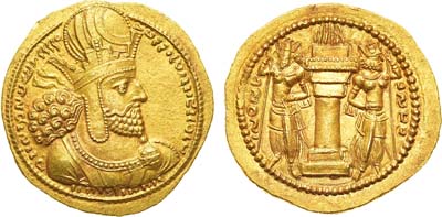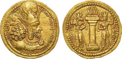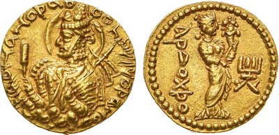 Золото. 8г. Балх. Аверс: круговая легенда "ÞαO α OÞαO OOhÞKI KOÞα O"; изображение правителя на облаках в диадеме и с нимбом - влево; со скипетром и копьём в руках. Реверс: изображение богини Ардохш с рогом изобилия в руках - вправо; вертикальная легенда "αPΔOXÞO". Göbl Kushan 286, ANS Kushan 749. AU/UNC.
