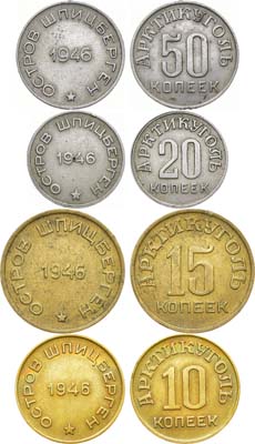 50 копеек 1946. Мельхиор, 22 мм. 3,53 гр. Федорин VI 55-РДЗ. Мелкие дефекты гурта. AU. 20 копеек 1946. Мельхиор 20 мм. 2,53 гр. Федорин VI 54-РДЗ. Мелкие дефекты гурта. AU. 15 копеек 1946. Бронза 25 мм. 5,22 гр. Федорин VI 53-РДЗ. AU. 10 копеек 1946. Бронза 22 мм. 2,92 гр. Федорин VI 52-РДЗ. AU.