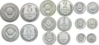 Медно-никелевый сплав белого цвета. 5 рублей 1956 года. Вес 18,16 г. Диаметр 34 мм. Аверс: без клейма и номера сплава. Федорин, Ушаков 379 (Р-5). 3 рубля 1956 года. Вес 14,73 г. Диаметр 31,6 мм. Аверс: без клейма и номера сплава. Пробная. Федорин, Ушаков 334 (Р-5). 2 рубля 1956 года. Вес 9,72 г. Диаметр 29 мм. Аверс: без клейма и номера сплава. Федорин, Ушаков 334 (Р-5). 1 рубль 1956 года. Вес 8,7 г. Диаметр 27 мм. Аверс: без клейма и номера сплава. Федорин, Ушаков 293 (Р-4). 50 копеек 1956 года. Вес 4,79 г. Диаметр 24 мм. Аверс: без клейма и номера сплава. Федорин, Ушаков 250 (Р-4). 20 копеек 1956 года. Вес 3,98 г. Диаметр 21,8 мм. Аверс: без клейма и номера сплава, звезда плоская. Федорин, Ушаков 215 (ЕД). 15 копеек 1956 года. Вес 2,78 г. Диаметр 19,56 мм. Аверс: без клейма и номера сплава. Федорин, Ушаков 181 (Р-4). 10 копеек 1956 года. Вес 1,41 г. Диаметр 1,75 мм. Аверс: без клейма и номера сплава. Федорин, Ушаков 147 (Р-4). AU/UNC.