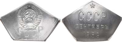 Железо-хромово-никелевый сплав. Размер 43х28 мм. Ленинградский монетный двор. Аверс: штемпель 5 копеек 1957 года. Реверс: надпись в три строки: "СССР / СЕНТЯБРЬ / 1959". ФедоринVI Приложение, с.506 #18. AU 58.