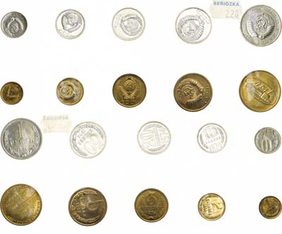 Ленинградский монетный двор. Гибкий пластик. В набор входят: бронзовый жетон ЛМД, 1 рубль, 50 копеек, 20 копеек, 15 копеек, 10 копеек, 5 копеек, 3 копейки, 2 копейки, 1 копейка. 1 рубль 1974 года. Федорин VI 25 (звезда в гербе с узкими лучами (4 у.е.)). 50 копеек 1974 года. Федорин VI 37. 20 копеек 1974 года. Федорин VI 125 (вторые колосья справа и слева без остей, гребёнка без уступа (25 у.е.)). 15 копеек 1974 года. Федорин VI 142 (Вторые колосья справа и слева без остей (25 у.е.)). 10 копеек 1974 года. Федорин VI 136. 5 копеек 1974 года. Федорин VI 312. 3 копейки 1974 года. Федорин VI 164 (поверхность витков ленты плоская, аверс 20 копеек 1973 (Ф-89)(700 у.е.)). 2 копейки 1974 года. Федорин VI 124 (наружная гребёнка остей с уступом, (300 у.е.)). 1 копейка 1974 года. Федорин VI 154 (наружная гребёнка остей без уступа). Петров, Федорин 306, 307, 308, 310, 311, 312, 314(Р-2), 316(Р-2), 319. BUNC.