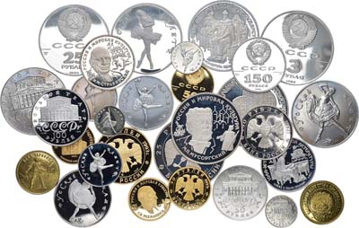 Пара односторонних оттисков червонца 1976 года. Медно-цинковый сплав. Гурт гладкий. Вес аверса: 4,47 г. Вес реверса: 3,85 г. UNC. Пара односторонних оттисков 150 рублей 1988 года. Слово о полку Игореве. Медно-никелевый сплав. Ленинградский монетный двор. Гурт рубчатый. Вес аверса: 2,71 г. Вес реверса: 2,98 г. PROOF. Пара односторонних оттисков 50 рублей 1988 года. Софийский собор. Медно-цинковый сплав. Московский монетный двор. Гурт рубчатый. Вес аверса: 3,24 г. Вес реверса: 3,19 г. PROOF. Пара односторонних оттисков 3 рублей 1988 года. Сребреник Владимира. Медно-никелевый сплав. Ленинградский монетный двор. Гурт рубчатый. Вес аверса: 2,98 г. Вес реверса: 2,98 г. PROOF. Пара односторонних оттисков 25 рублей 1989 года. Иван III - основатель единого государства. Медно-никелевый сплав. Ленинградский монетный двор. Гурт рубчатый. Вес аверса: 3,83 г. Вес реверса: 2,61 г. PROOF. Односторонний оттиск реверса 25 рублей 1989 года. Русский балет. Медно-никелевый сплав. 2,67 г. Гурт рубчатый. PROOF. Пара односторонних оттисков 100 рублей 1991 года. Русский балет. Медно-никелевый сплав. Ленинградский монетный двор. Гурт рубчатый. Вес аверса: 18,35 г. Вес реверса: 18,18 г. UNC. Пара односторонних оттисков 100 рублей 1991 года. Русский балет. Медно-никелевый сплав. Ленинградский монетный двор. Гурт рубчатый. Вес аверса: 7,23 г. Вес реверса: 7,27 г. PROOF. Пара односторонних оттисков 50 рублей 1991 года. Русский балет. Медно-никелевый сплав. Ленинградский монетный двор. Гурт рубчатый. Вес аверса: 9,26 г. Вес реверса: 9,22 г. UNC. Односторонний оттиск реверса 50 рублей 1991 года. Русский балет. Медно-никелевый сплав. 3,58 г. Гурт рубчатый. PROOF. Пара односторонних оттисков 25 рублей 1991 года. Русский балет. Медно-никелевый сплав. Ленинградский монетный двор. Гурт рубчатый. Вес аверса: 3,66 г. Вес реверса: 3,67 г. UNC. Пара односторонних оттисков 25 рублей 1991 года. Русский балет. Медно-никелевый сплав. Ленинградский монетный двор. Гурт рубчатый. Вес аверса: 1,39 г. Вес реверса: 1,40 г. PROOF. Пара односторонних оттисков 10 рублей 1991 года. Русский балет. Медно-никелевый сплав. Ленинградский монетный двор. Гурт рубчатый. Вес аверса: 1,88 г. Вес реверса: 1,88 г. PROOF. Пара односторонних оттисков 150 рублей 1993 года. И.Ф. Стравинский. Медно-никелевый сплав. Ленинградский монетный двор. Гурт рубчатый. Вес аверса: 1,89 г. Вес реверса: 1,84 г. PROOF. Односторонний оттиск аверса 100 рублей 1993 года. Медно-цинковый сплав. 6,13 г. Московский монетный двор. Гурт рубчатый. PROOF. Односторонний оттиск реверса 50 рублей 1993 года. Русский балет. Медно-цинковый сплав. 3,66 г. Гурт рубчатый. PROOF. Пара односторонних оттисков 50 рублей 1993 года. С.В. Рахманинов. Медно-цинковый сплав. Московский монетный двор. Гурт рубчатый. Вес аверса: 3,65 г. Вес реверса: 3,70 г. PROOF. Пара односторонних оттисков 25 рублей 1993 года. М.П. Мусоргский. Медно-никелевый сплав. Ленинградский монетный двор. Гурт рубчатый. Вес аверса: 2,96 г. Вес реверса: 3,03 г. PROOF. Пара односторонних оттисков 3 рублей 1993 года. Русский балет. Медно-никелевый сплав. Московский монетный двор. Гурт рубчатый. Вес аверса: 19,73 г. Вес реверса: 19,00 г. UNC. Пара односторонних оттисков 3 рублей 1993 года. Анна Павлова. Медно-никелевый сплав. Ленинградский монетный двор. Гурт рубчатый. Вес аверса: 3,52 г. Вес реверса: 3,09 г. PROOF. Односторонний оттиск реверса 5 рублей 1993-1994 гг. Русский балет. Медно-никелевый сплав. 1,17 г. Гурт рубчатый. UNC.