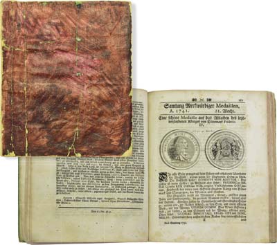 Нюрнберг, 1741 год. В переплет включены еженедельные выпуски с 16-ой (22 апреля) по 38-ю (23 сентября) неделю 1741 года. На протяжении многих лет, начиная с 1737 года И.И. Лохнер выпускал еженедельно по одному выпуску, посвященному одной интересной европейской медали/медальону XVI-XVIII века. Каждый выпуск содержит в себе высококачественную гравюру с изображением медали с двух сторон, ее фактическое описание. А затем приводится подробнейшее описание исторических/политических событий, обусловивших появление данной медали. В данную книгу вошла только часть выпусков за 1741 год.
