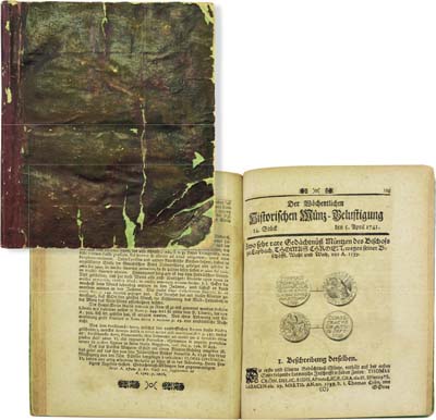 Нюрнберг, 1741 г. В переплет включены еженедельные выпуски с 3-ей (18 января) по 17-ю (26 апреля) неделю 1741 года. Дополнительно включен в переплет выпуск 34 от 21 августа 1748 года. На протяжении многих лет, начиная с 1729 года И.Д. Кёлер выпускал еженедельно по одному выпуску, посвященному одной интересной европейской монете/медали XVI-XVIII века. Каждый выпуск содержит высококачественную гравюру с изображением монеты с двух сторон, ее подробное фактическое описание с расшифровкой всех надписей и сокращений. А затем приводится подробнейшее описание исторических/политических событий, обусловивших появление данной монеты. С приложением ссылок на официальные документы или генеалогию правящих семей Европы. В данную книгу вошла только часть выпусков за 1741 год.